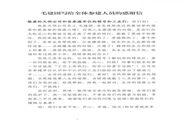 近日,公司神華天明項目部承建的神華四川江油煤炭儲備發(fā)電一體化新建工程收到了甲方神華天明發(fā)電公司及其員工毛建國寄來的感謝信,對項目部積極組織愛心捐款活動,幫助毛建國家人一事表示衷心的感謝。